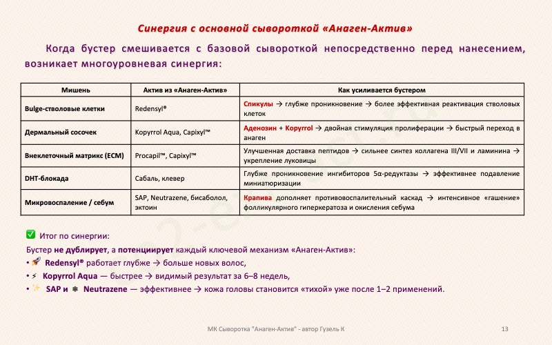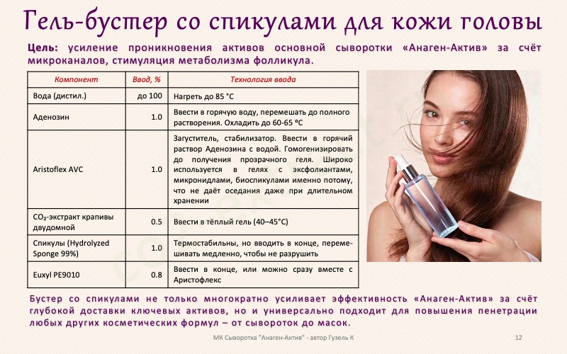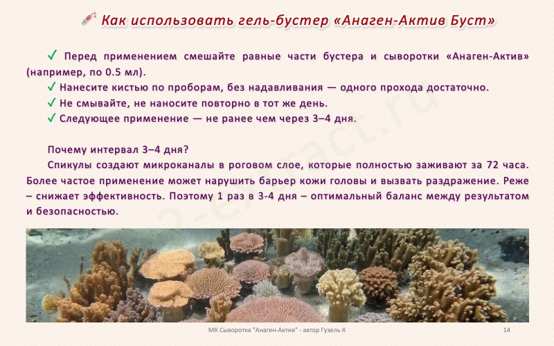 Поясню сейчас. Если сегодня используете сыворотку Анаген-актив вместе с гелем-бустером, то есть вместе со спикулами, то завтра вы используйте уже только Анаген-актив без бустера (без спикул). Мы же гель-бустер не весь смешиваем с Анаген-активом, а только чуточку. Поэтому остальные дни - чистый Анаген-актив продолжаем как обычно, не отлынивая.